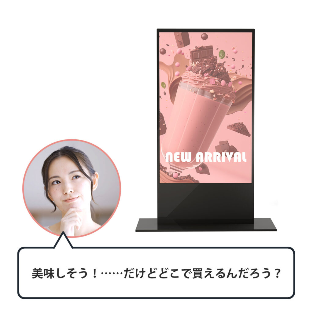 商品の訴求だけでなく、セールや発売予定の商品を告知したり、他社広告を流して収益化もすることができます。上部に21.5インチモニタを設置し、そちらで流すことも可能です。