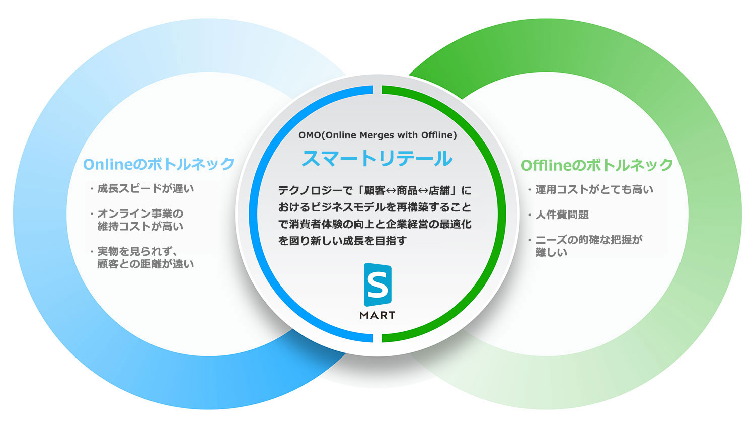 そこでスマリテはテクノロジーを用いた「OMO – Online Merges with Offline」のビジネスモデルを構築し、オンラインとオフライン双方の問題に、新たな解決策を提示しています。