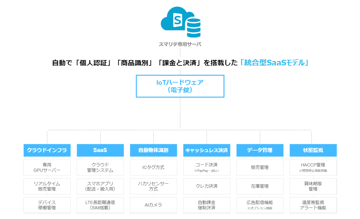 「株式会社スマリテ」は、自動で個人認証・商品識別・課金-決済を行う無人店舗機能を搭載した『電子錠制御システム』の他、HACCPにも対応し、リアルタイムに状態や販売数・傾向等を把握できる『商品のモニタリングシステム』、商品陳列棚の前面に半透明のサイネージを配置することで販売と訴求の距離を0にする『スマリテサイネージ』CO2排出量等を自動計算しSDGsへの貢献度を可視化する『Smart Retail ESG』等、小売業を改革するためのあらゆるソリューションを提供しています。